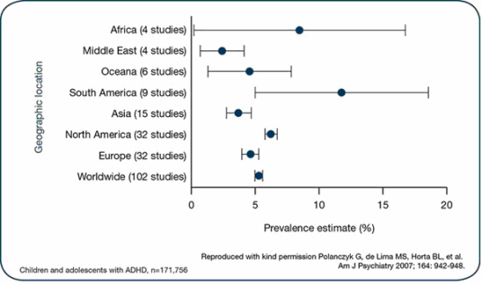 综合各方研究结果来看,ADHD对个体的影响遍及全球各个地区,地区间患病率有所差异,南美(11.8%)和非洲(8.5%)较高,中东和亚洲地区相对较低。患病率的差异与各地区对疾病的辨识率和诊断率的差异直接相关;其次诊断标准的演变和研究方法的差异对流行病学数据也有影响。文化背景,社会经济状态,教育程度,医疗条件等可导致不同国家或同一国家不同地区之间对ADHD的普及率、辨识率、诊断率和干预率出现较大差异。