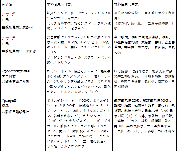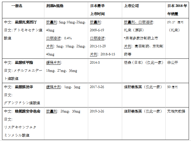 目前,日本儿童ADHD的患病率约为3%~7%,成人ADHD的患病率约为2%~2.5%,而且ADHD患病率呈上升趋势。在日本上市治疗ADHD的药物有四种分别为盐酸托莫西汀制剂(剂型:胶囊剂、口服溶液、片剂)、盐酸哌甲酯缓释片、盐酸胍法辛缓释片、赖氨酸安非他命胶囊。盐酸哌甲酯缓释片、盐酸胍法辛缓释片、赖氨酸安非他命胶囊均无仿制药上市。