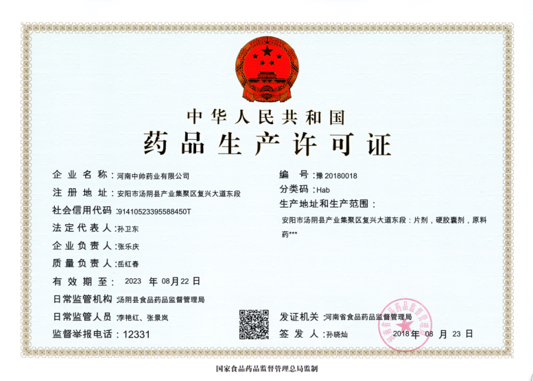 2018年8月23日,河南省食品药品监督管理局正式向我公司子公司颁发中华人民共和国药品许可证。证书编号:豫20180018。